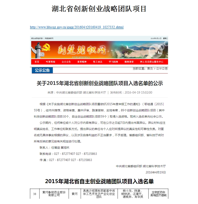 2016年4月,公司奧美沙坦原料藥配套中間體工藝開(kāi)發(fā)及產(chǎn)業(yè)化項目成功入選2015年湖北省自主創(chuàng )業(yè)戰略團隊項目名單,可獲得政府創(chuàng )業(yè)資金扶持。